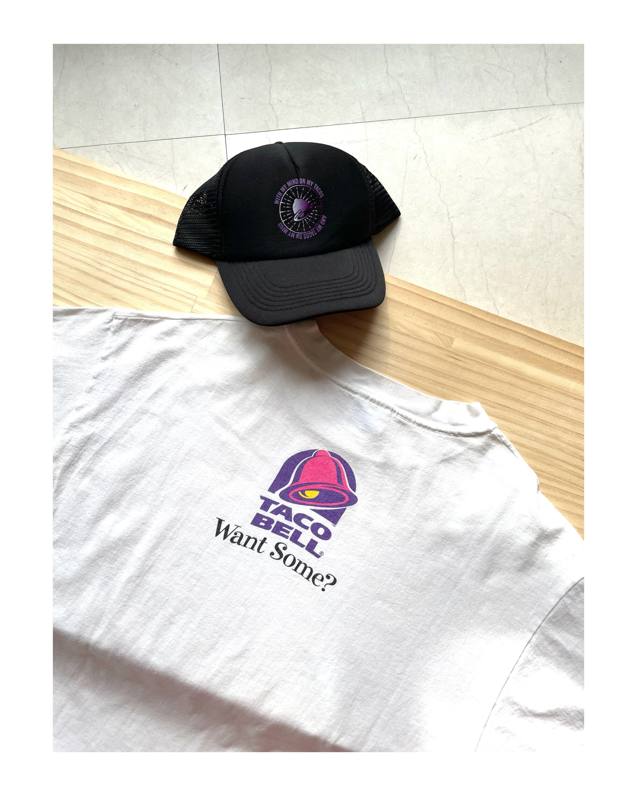 バックにはタコベルの企業ロゴに Want Some? 食べる?と